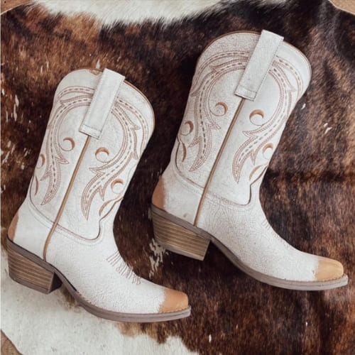 This standout model combines traditional craftsmanship with unique celestial prints and moon motifs, offering a modern, artistic flair to the classic cowgirl silhouette.